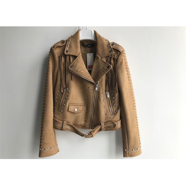 Dark Brown Suede Ladies PU Jacket Belted Jacket Womens Macrame Decorated Images |